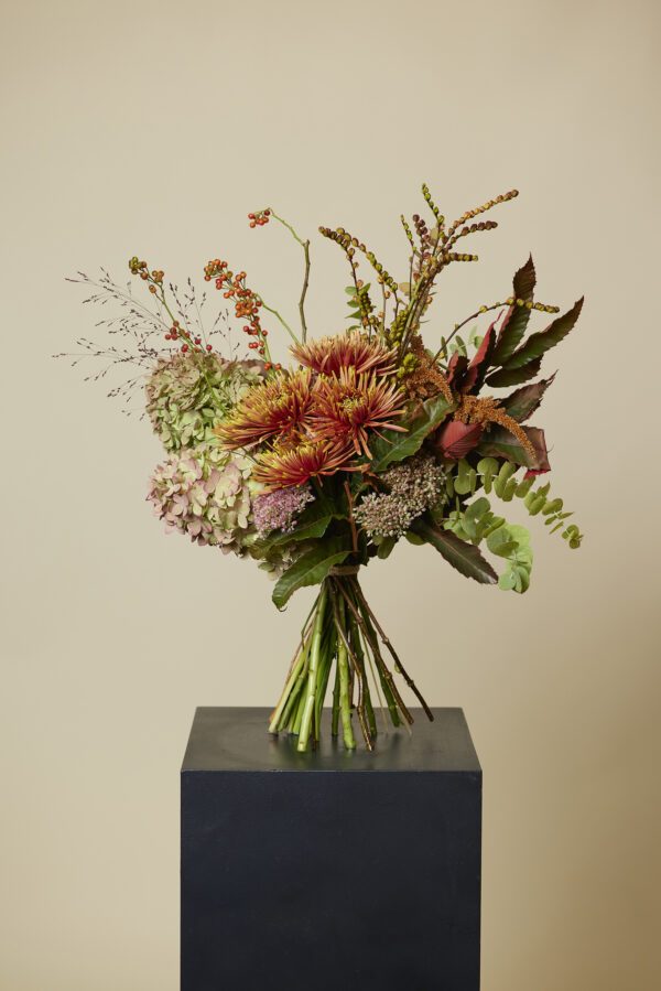 Bouquet de fleurs et végétaux de saison composé d’hortensia, chrysanthème, sédum, crocosmia, graminée, baie de rosier et feuillages.