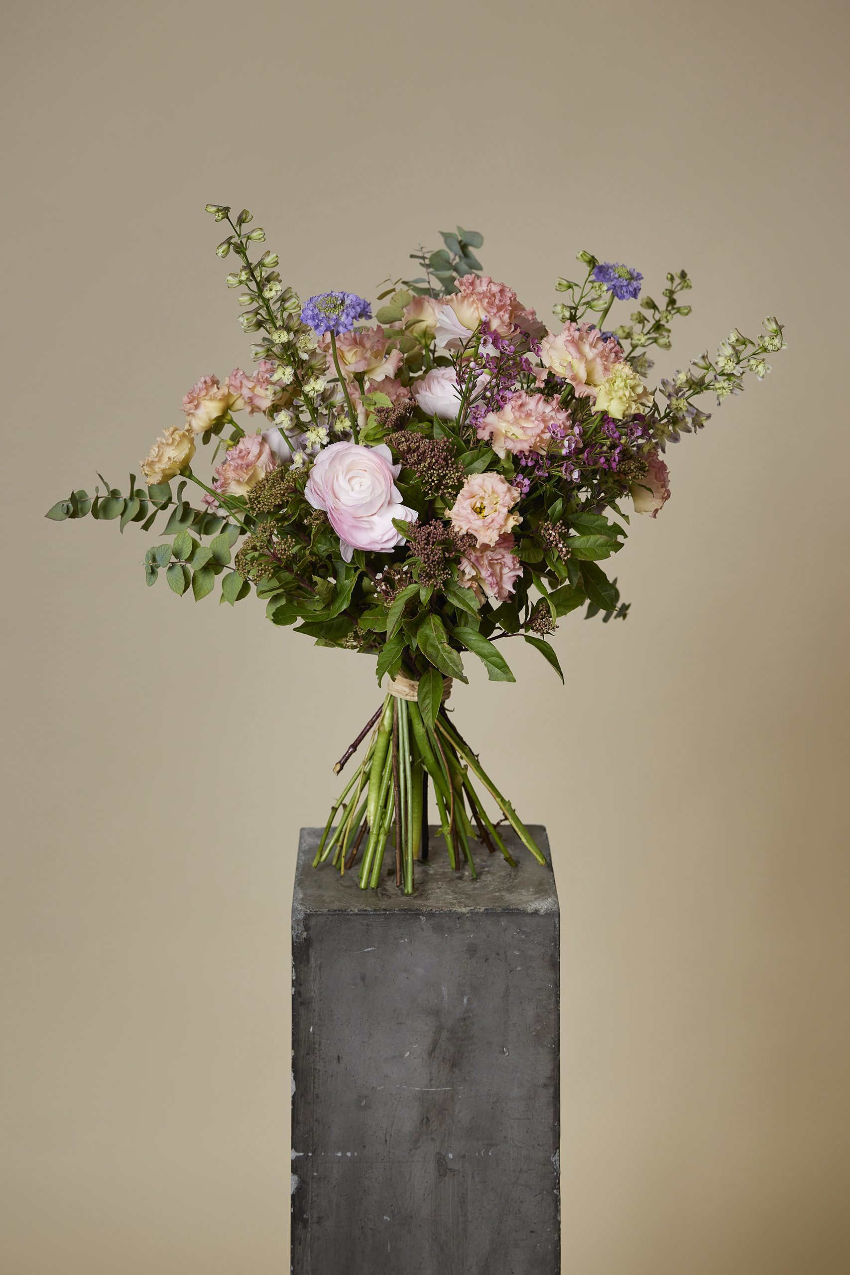 Bouquet de fleurs et végétaux de saison composé de Delphiniums,renoncules hanoi, lisianthus,wax,scabieuses et feuillages