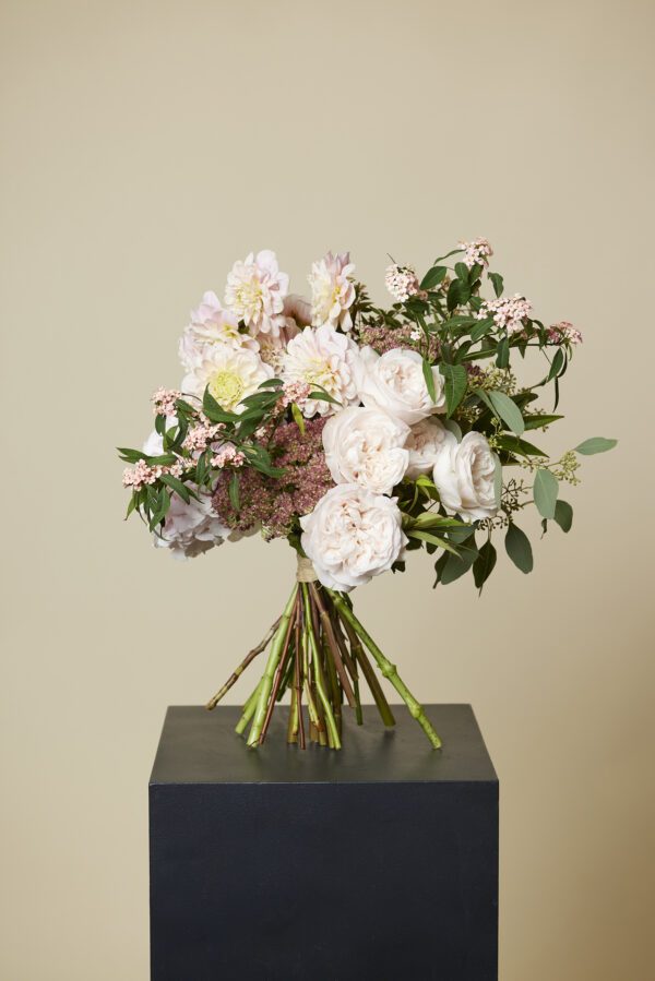 Bouquet de fleurs et végétaux de saison composé d’hortensia, rose, dalhia, euphorbe, sédum et feuillages.