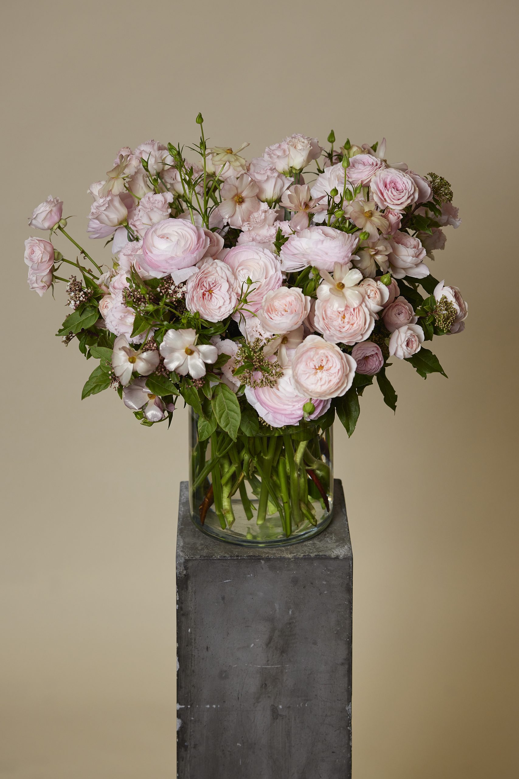 Bouquet de fleurs et végétaux de saison composé de roses branchues, renoncule, lisianthus, butterfly et feuillages.