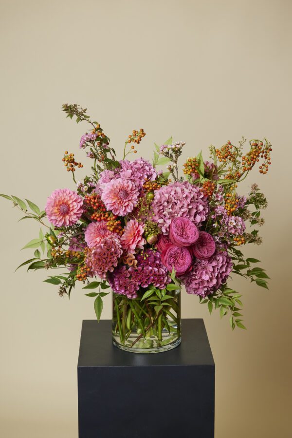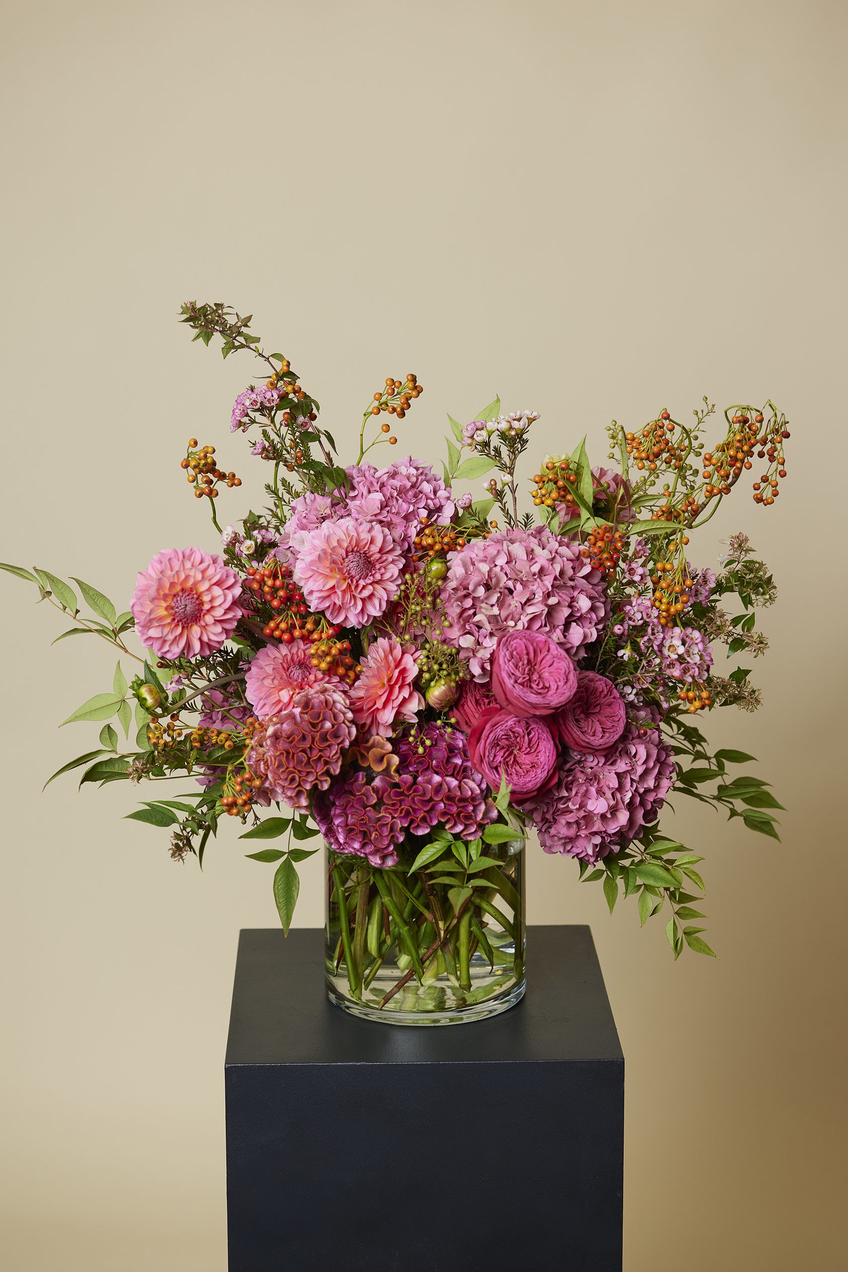 A bouquet of seasonal flowers and plants including hydrangeas, sweet peas, clematis, lisianthus, nigella, delphinium and eucalyptus. Varies according to the season. Available in 3 sizes and made-to-measure.